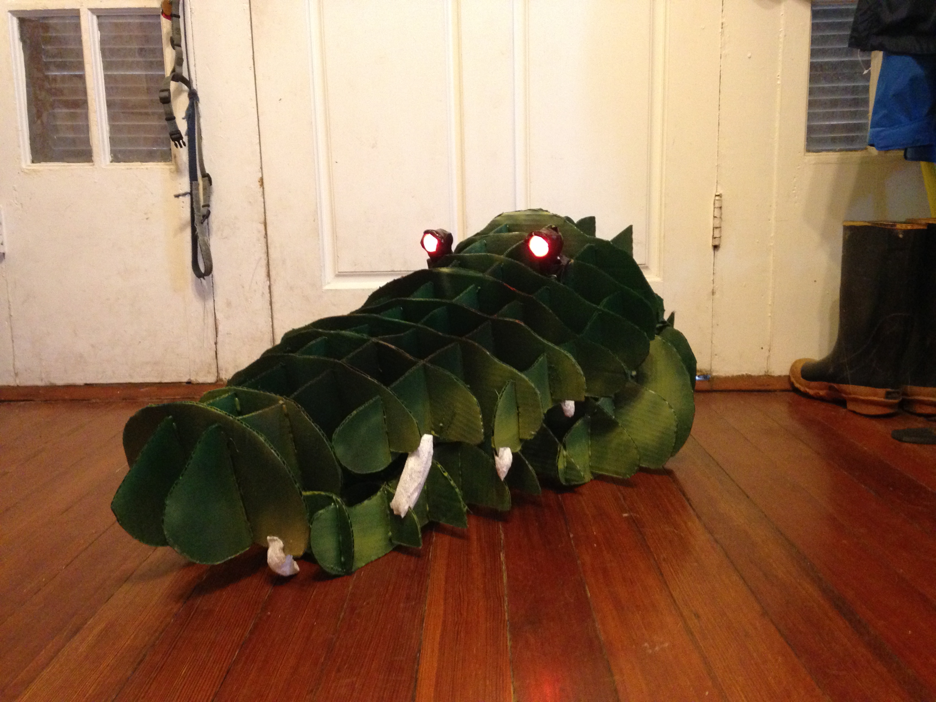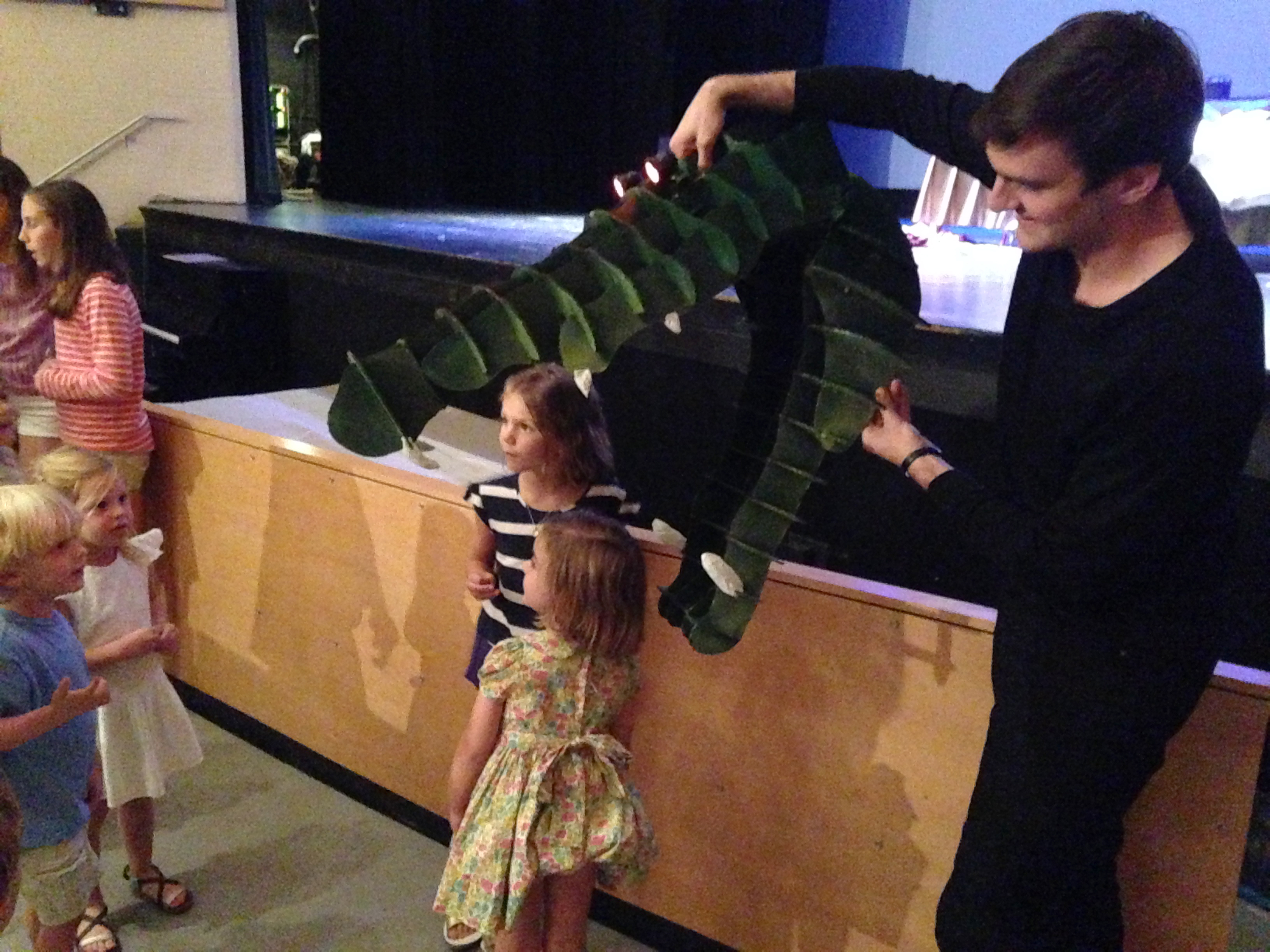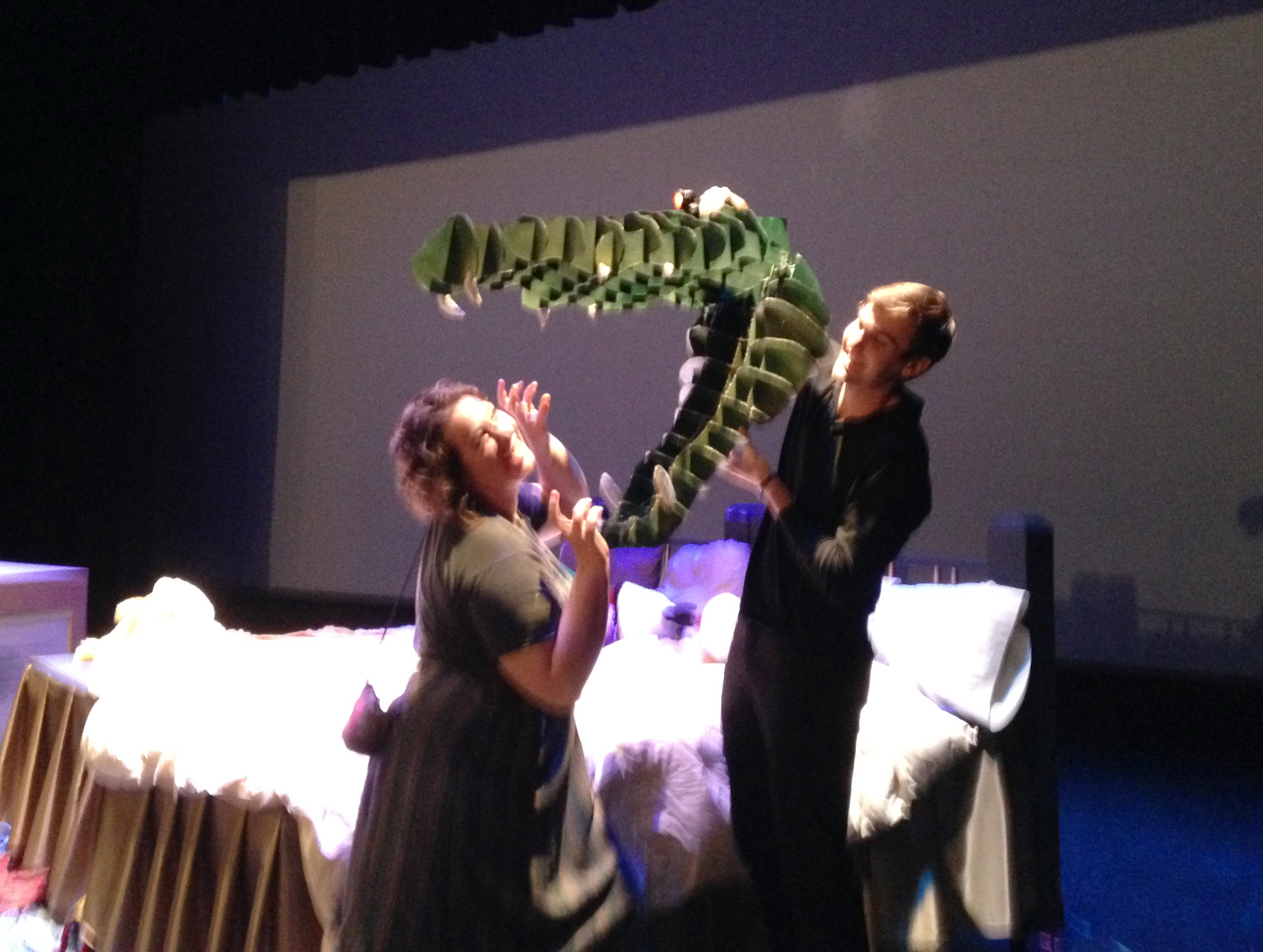 This summer, I had the distinct pleasure of collaborating with puppeteer, Eli Timm. He worked as part of the direction team for the Newman Summer Theater Conservatory for their production of Peter Pan, Jr. For the character of the crocodile, I designed a puppet that we blew up to 3 feet long and constructed out of cardboard, complete with foam teeth and glowing eyes. Eli really brought Tic Toc Croc to life; every time he would poke his head up out of the pit, a little girl in the front row would scream. A mark of a successful puppet/puppeteer, I think!